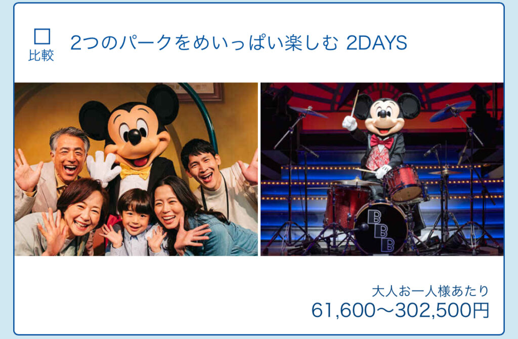 【2つのパークをめいっぱい楽しむ2DAYS】で1日目東京ディズニーランド、2日目東京ディズニーシーを満喫できる1泊2日のプランです。